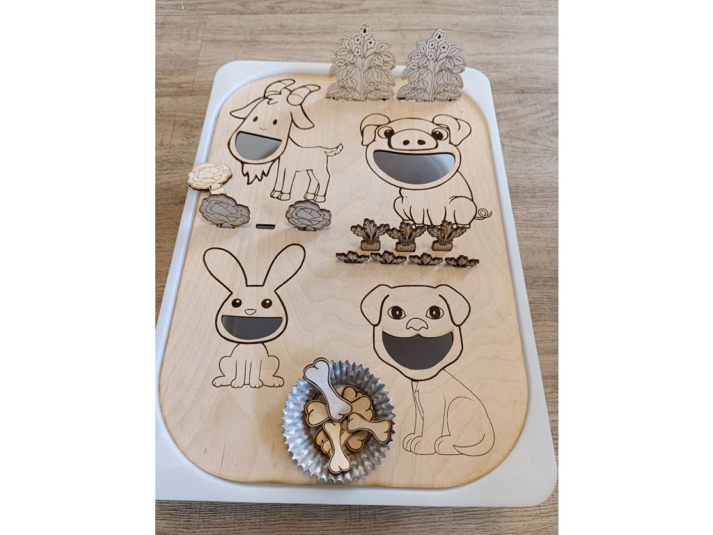 Doplňky: 2x brambory, 3x zelí, 4x větší mrkev (např. zralejší) 4x menší mrkev (méně zralá, pro dítě těžší vytáhnout), 4x malá kostička, 3x střední kostička, 2x velká kostička, miska pro pejska, pytlíček zeleně obarvené rýže pro další krmení a trénovaní dalších nástrojů např. lžičkou