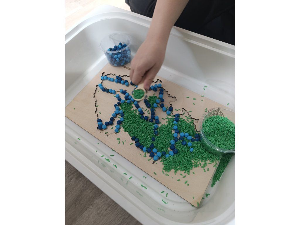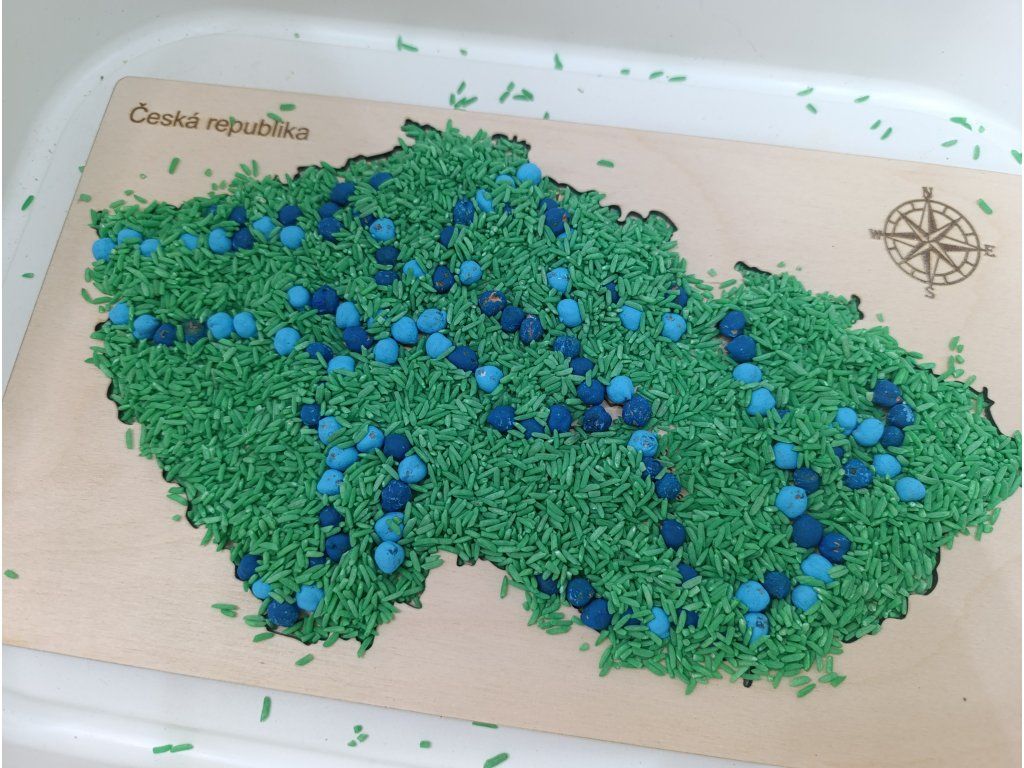 Hravé učení – děti se hravou formou učí poznávat Českou republiku, její kraje a řeky. Desku můžete využít také jako vysypávací tácek pro sensory play viz fotografie.