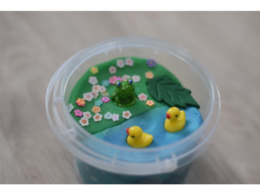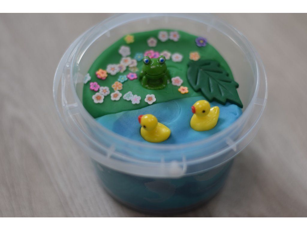 Žabka a kačenky - U rybníka : v praktickém kyblíčku najdete 300 g modelíny v barvě modré, žluté a růžové. Modelína je doplněna o žabičku, 2 kačenky, list, malé drobné kytičky.