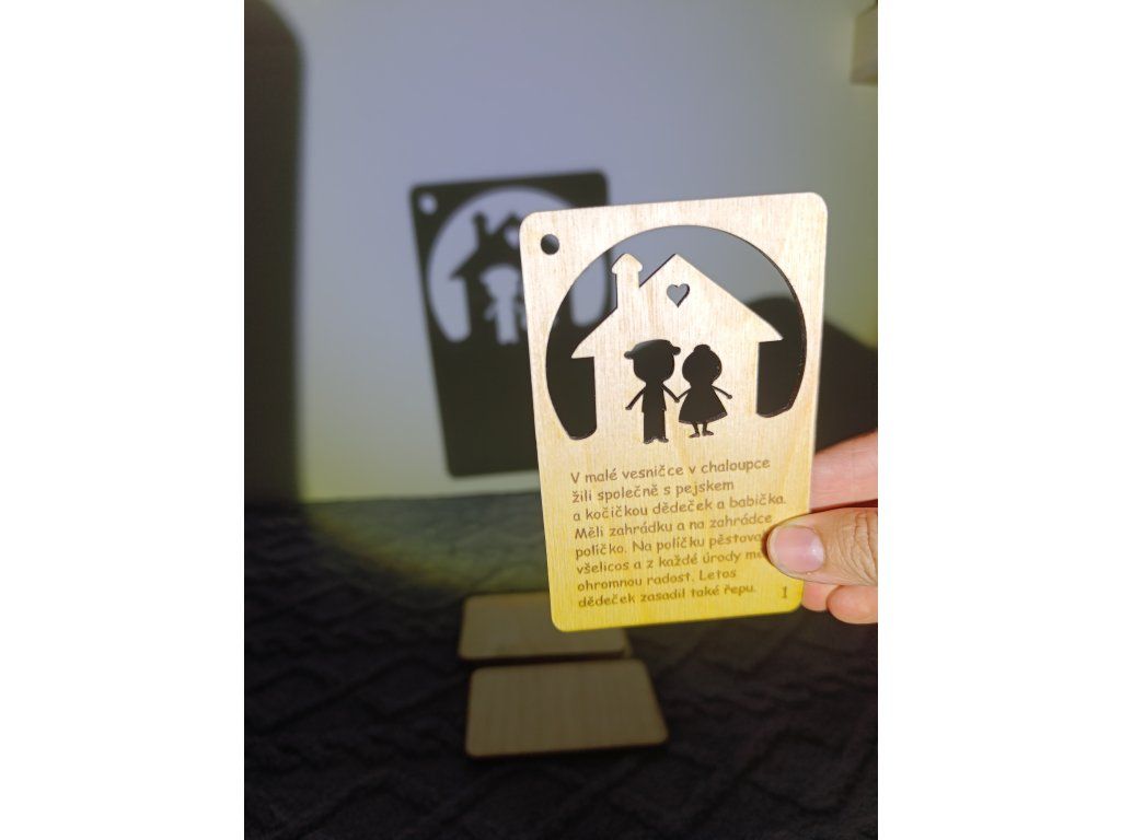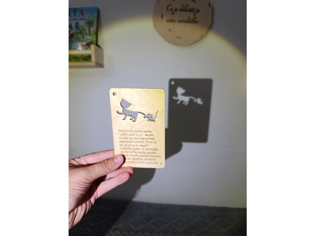 Tyto promítací pohádky pro děti jsou rozepsané na několika dřevěných kartičkách, na kterých je kromě textu také ilustrovaný výřez. Při vyprávění stačí kartu prosvítit mobilem nebo baterkou a kouzlo stínového divadla může začít.