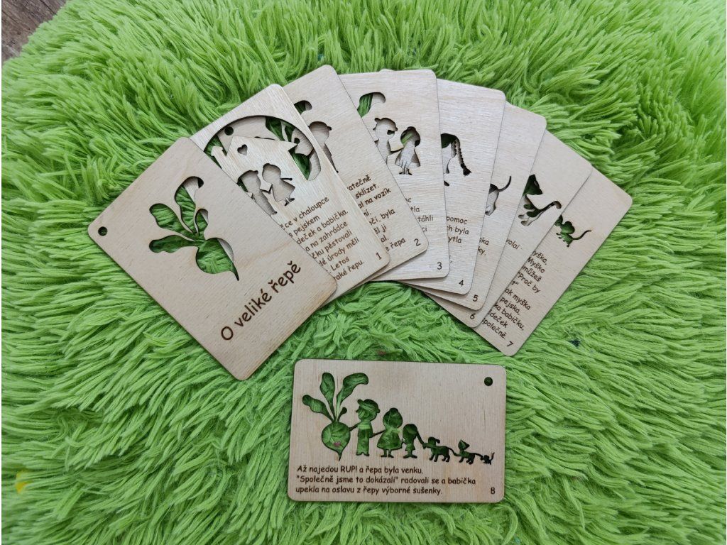 O VELIKÉ ŘEPĚ - Chcete vědět jak vytáhnout velikánskou řepu? Kolik je na to potřeba lidí a zvířátek? Pořiďte si naši pohádku O veliké řepě. Pohádková sada obsahuje 9 kusů dřevěných kartiček určených k prosvícení baterkou nebo telefonem.
