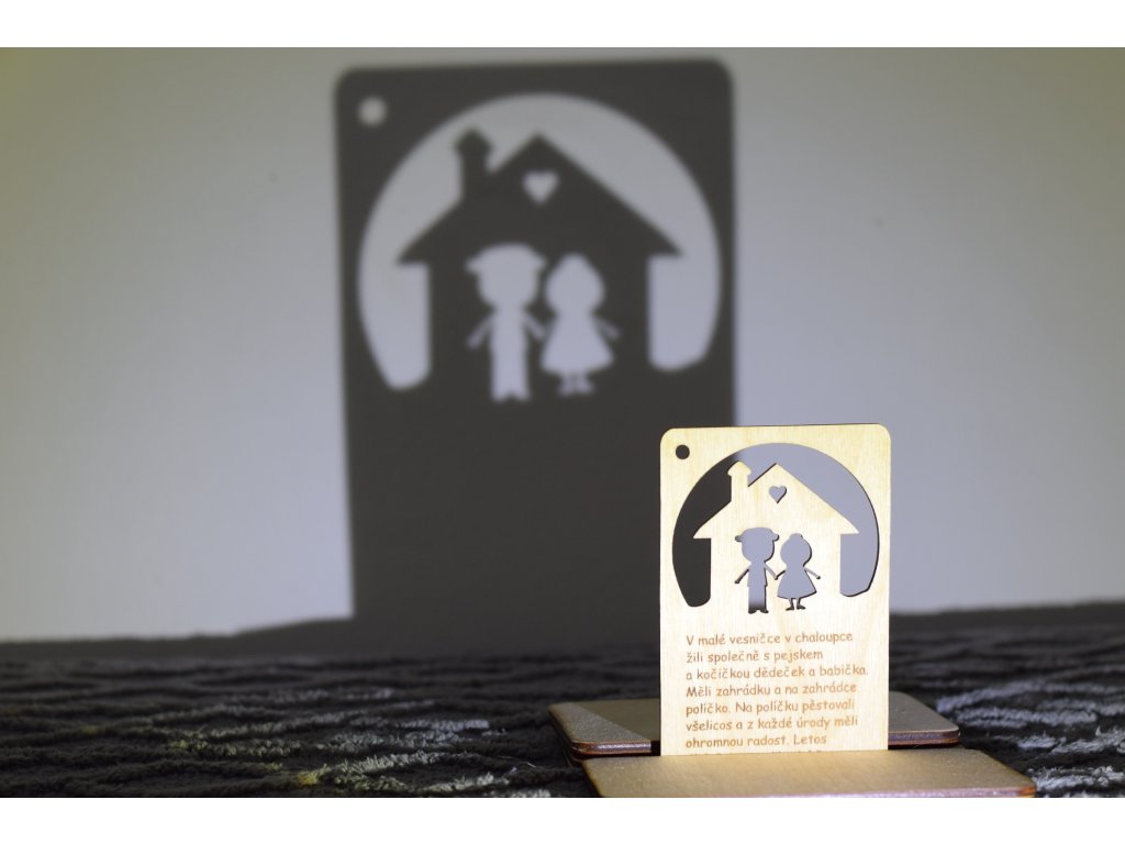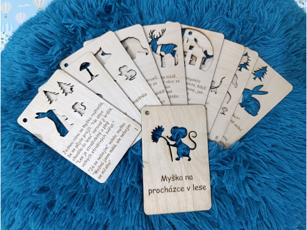 MYŠKA NA PROCHÁZCE V LESE - o myšce, která se jednoho krásného dne vydá do lesa a nebojí se ani velkých zvířat, která obvykle budí hrůzu. Zdá se, že se nebojí opravdu ničeho a nikoho. Nebo ne? Nebo se přeci jen najde někdo, kdo jí hrůzu nahání? Pohádková sada obsahuje 10 kusů dřevěných kartiček určených k prosvícení.