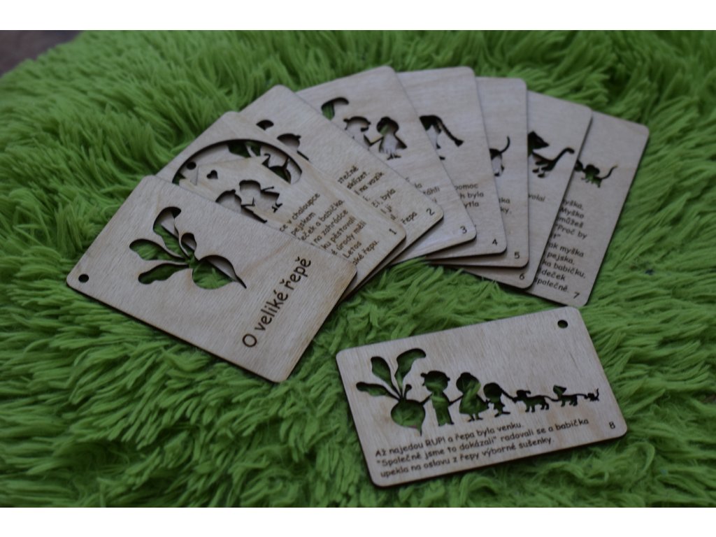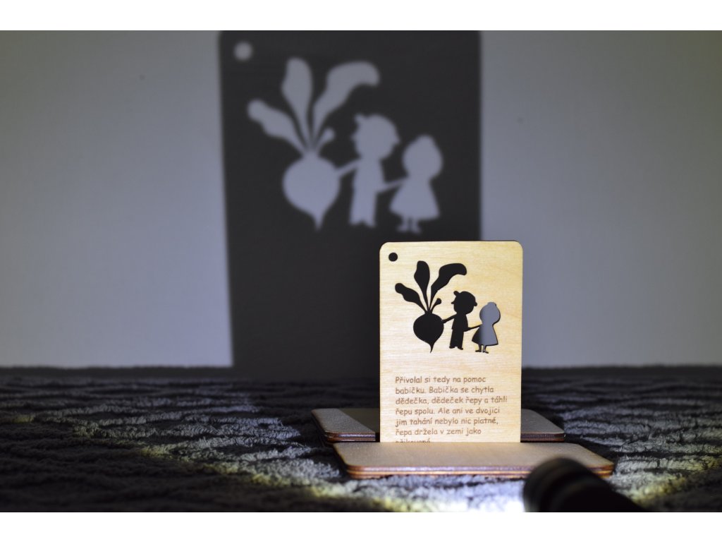 O VELIKÉ ŘEPĚ - Chcete vědět jak vytáhnout velikánskou řepu? Kolik je na to potřeba lidí a zvířátek? Pořiďte si naši pohádku O veliké řepě. Pohádková sada obsahuje 9 kusů dřevěných kartiček určených k prosvícení.