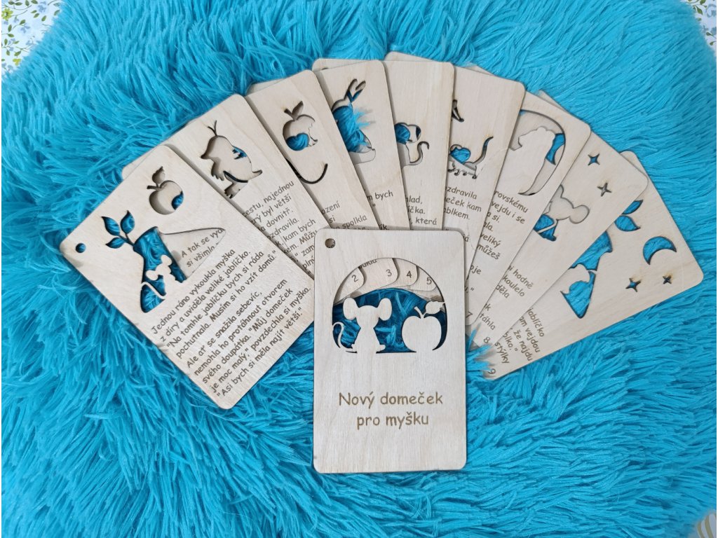 MYŠKA HLEDÁ NOVÝ DOMEČEK - Myška našla jablíčko a potřebuje najít větší byteček, aby se do něj vešla i s jablíčkem. Ke komu se asi tak nastěhuje? Najde nakonec domeček kam se vejde i se svým jablíčkem. Pohádková sada obsahuje 10 kusů dřevěných kartiček určených k prosvícení.