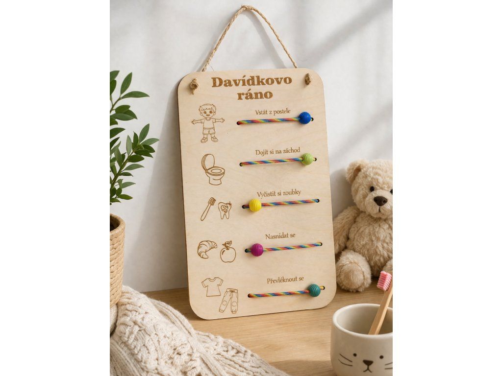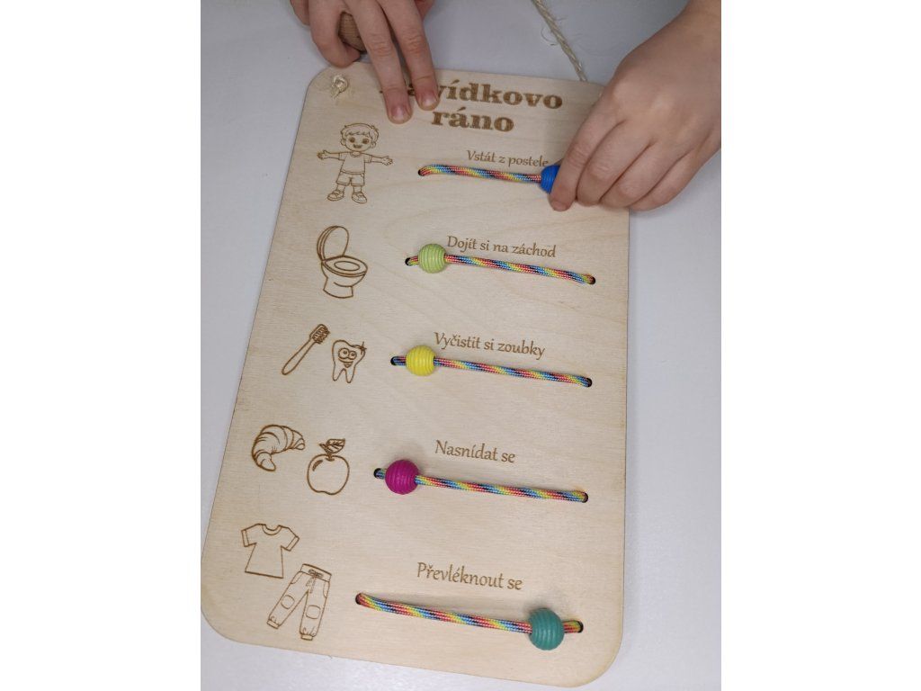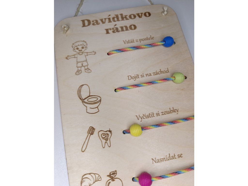 Další korálky už v libovolném pořadí, dítě si může samo vybrat co nejdříve udělá a vytváří si tak vlastní ranní rutinu a vy třeba stihnete i tu ranní kávu.