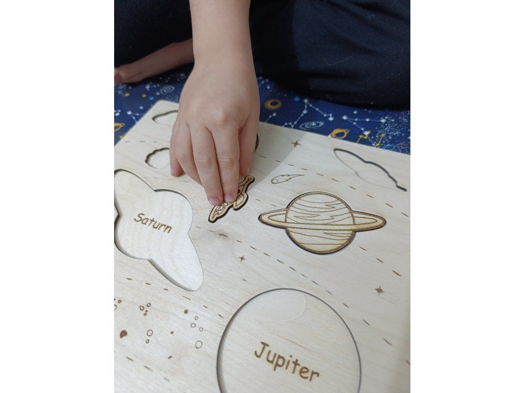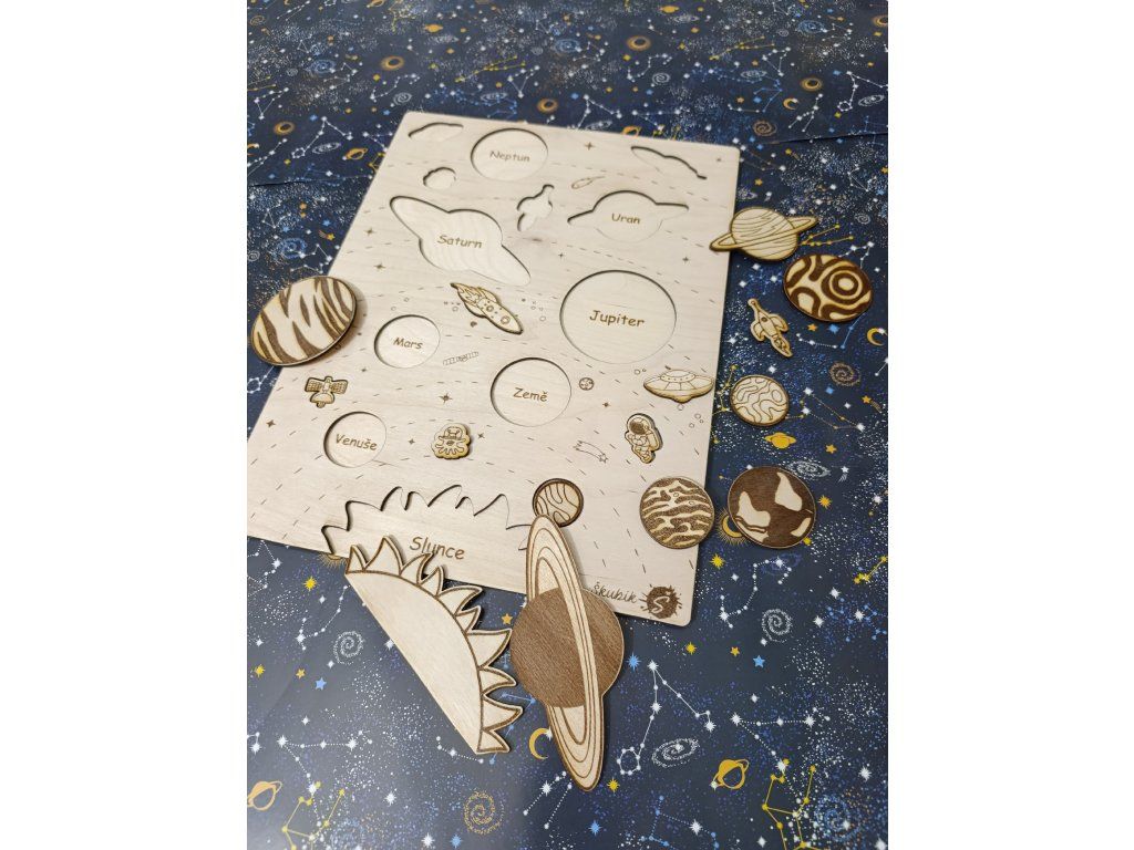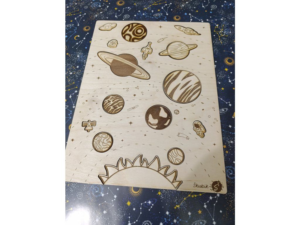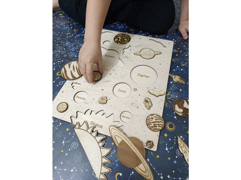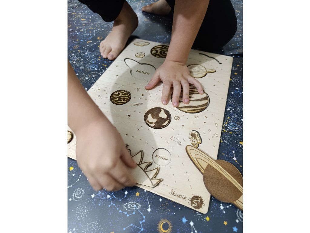 - originální vkládací puzzle ze dřevěné překližky je navržené tak, aby dětem hravou formou přiblížila planety sluneční soustavy a základní vesmírné pojmy.
