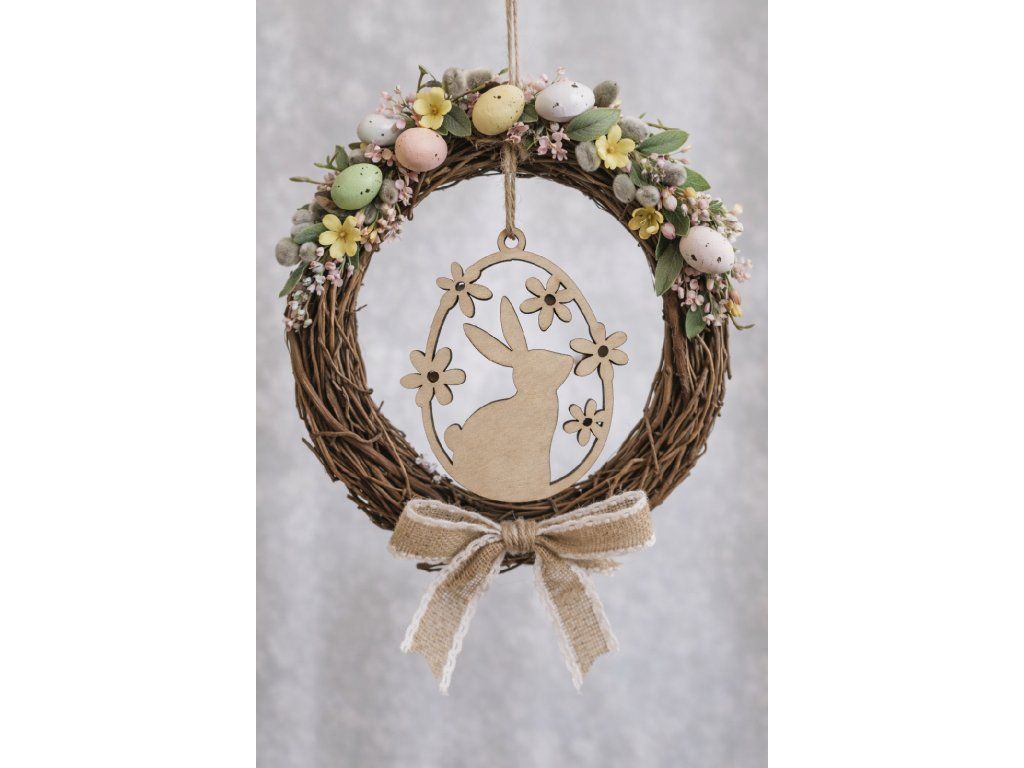 Vneste do svého domova jemnou atmosféru jara s touto dekorací. Elegantní motiv zajíčka zasazeného do květinového vajíčka působí něžně, vzdušně a přirozeně. Zavěšená uprostřed velikonočního věnce se stává jeho dominantou a krásně doplní výzdobu dveří, oken i interiéru.